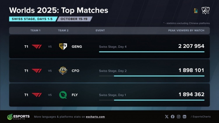 S15瑞士轮观赛数据:T1vsGEN人数达220万 前三均有T1战队